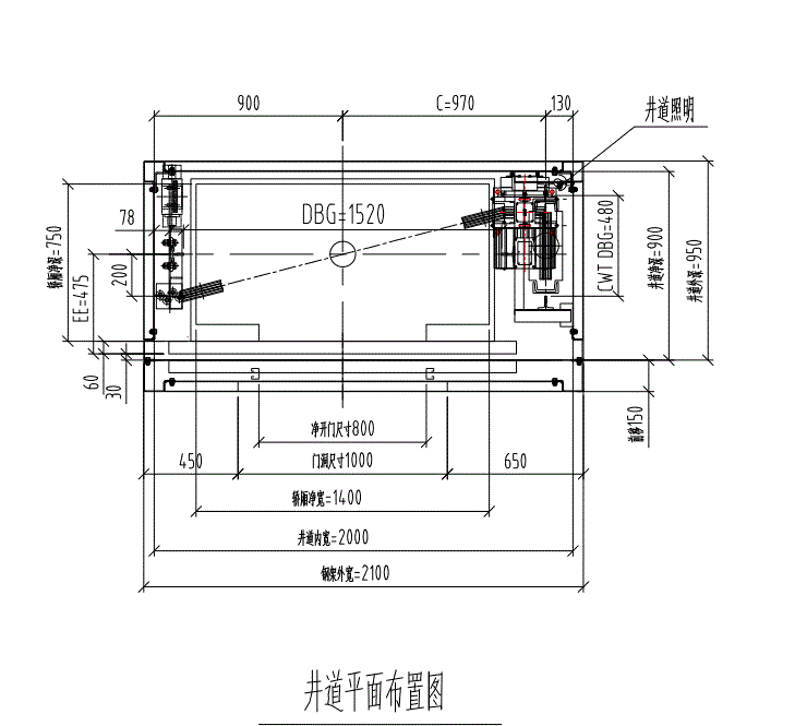空間尺寸寬2100mm深950mm,轎廂內(nèi)部?jī)舫叽鐚?/span>1400mm、深750mm,平開門開門寬度800mm。